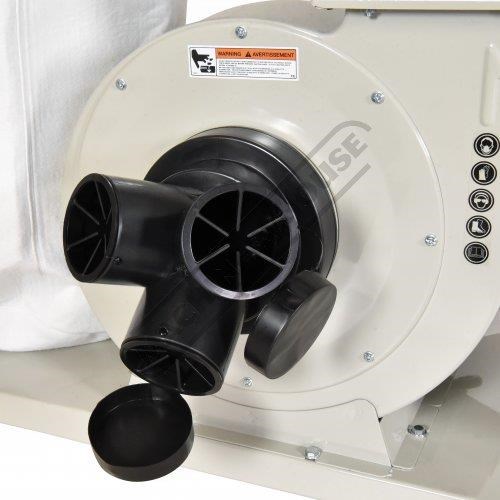 The dust and shavings of LPHV extractors are sucked through the impeller fan blade and then the waste falls into the lower bag, the air being exhausted through the top filter bag, collecting some of the fine dust on the way. This type of extraction shifts huge volumes of air at low pressure and they are very efficient at removing bulk waste such from Planers, Thicknessers & Wood Lathes etc, hence some people call them chip collectors. The down fall with all LPHV dust collector systems is when you reduce the intake hose from 100mm to 32mm the air flow volume is affected dramatically. The fine filtration efficiency can be improved somewhat by fitting a filter cartridge instead of the bag.